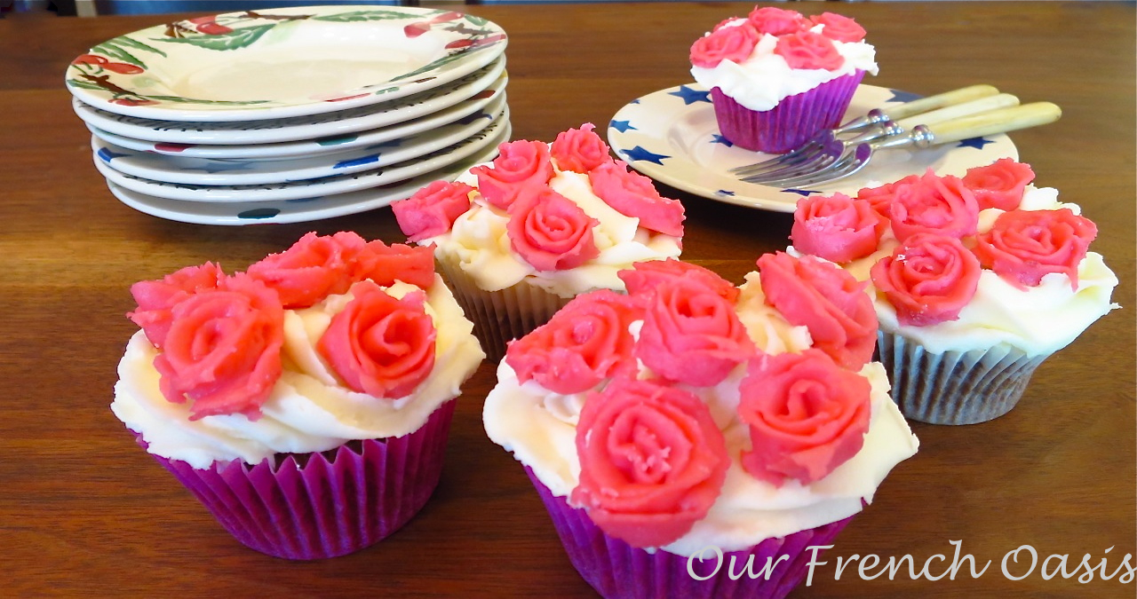 Do we ever need an excuse to eat cake?  Probably not but this was an excuse to be a little more creative than usual.  This is my standard cake recipe, I use it regularly whenever I make cupcakes or cakes.  I always use spelt flour, we love the slightly nutty flavor it gives, but this recipe works just as well with plain or wholewheat flour.  The cakes are a very light and fluffy sponge, not heavy at all as is sometimes the case with wholewheat flours.  I don’t normally spend hours piping icing onto my cupcakes, they don’t usually last long enough to warrant such effort and to be honest they taste so much nicer without the extra sugar!  However, these are special occasion cupcakes, I colored the butter icing with a little juice from some defrosted frozen raspberries and it produced a fabulous color without any artificial chemicals and gave the icing just the smallest hint of raspberry.