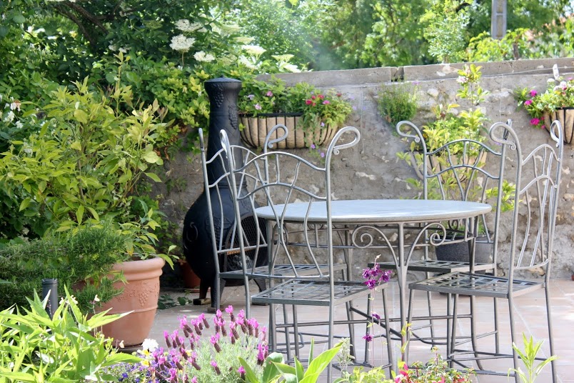 Surrounding the totally renovated and very authentic house, the garden is divided into a naturally flowing series of “rooms”. There is the wild garden; a natural habitat for birds, insects and hedgehogs of which they have several who live in the undergrowth. Then there is also a Mediterranean garden where grapevines and olive trees are sheltered from cold winds by old stone walls on four sides; this is the perfect place to enjoy one of the sun-loungers and wile away a few hours with a good book under the gently moving shade-sail. It was the sort of retreat that reminded me to constantly look at my watch and make sure not to be late to collect the children from school! There is also a small orchard and all of the ‘rooms’ surround the main garden with its herbaceous borders and a terrace where you can dine outside ; in fact the entire garden invites you to relax and enjoy it. Penny has planted 28 different species of rose and she knows each one by name, and she is quite capable of telling you exactly which scent comes from which rose. It is a garden free from pesticides, hence the abundance of butterflies and bees, and it is the perfect compliment to the interior of the house – both have a refined elegance but retain that air of casual comfortability that invites you to stay and linger.