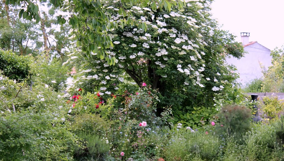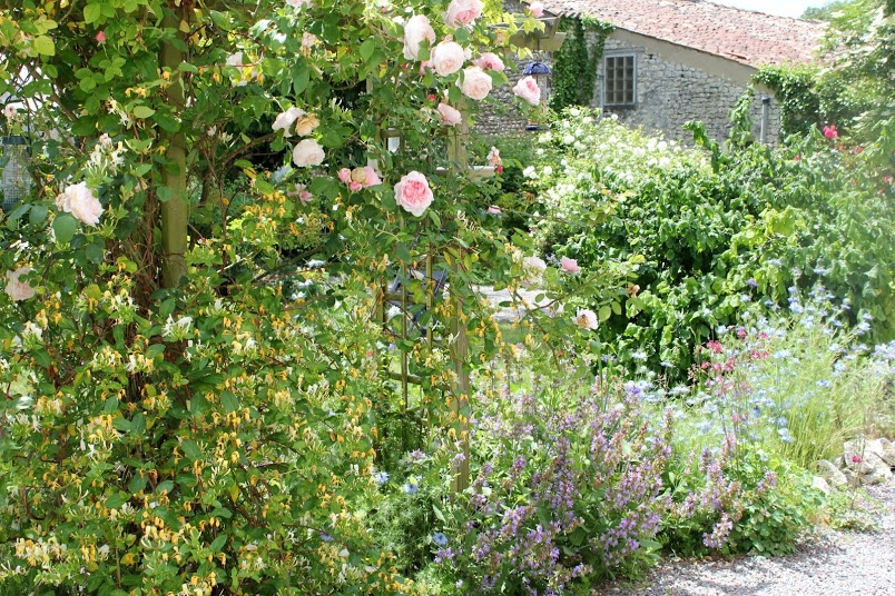 Looking around their property, Maison Maurice, it is hard to imagine that their home has not always been exactly as it is now. It is a beautiful old stone Charentaise house and barn, dating from the 1800’s; roses tumble down the walls and trees burst with fruit. However, it wasn’t just the house that needed total renovation, the garden was for the most part non existent – there was little here apart from a couple of trees and shrubs and a vast amount of brambles and weeds. Amongst the many jobs they undertook was the task of landscaping, and they have achieved a result little short of a miracle.