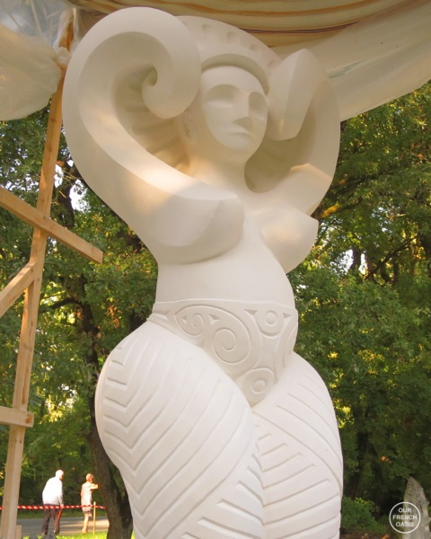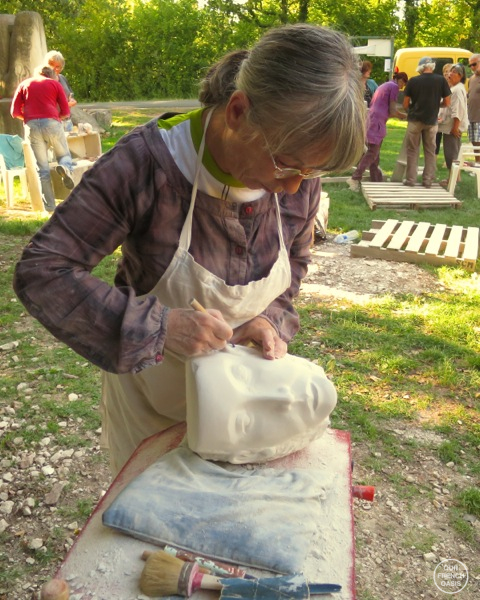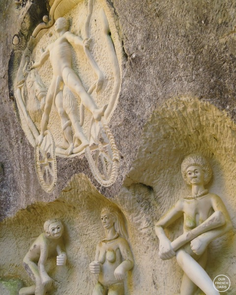 Last week, late one afternoon, Millie and I decided to have a walk through the woods at Port d’Envaux and see if we could find any of the legendary statues and carvings of the Lapidiales sculpture group, who hang out deep in the greenery each summer. We’d heard rumours that this was a real adventure, and it turned out to be not only that, but also a very interesting experience.