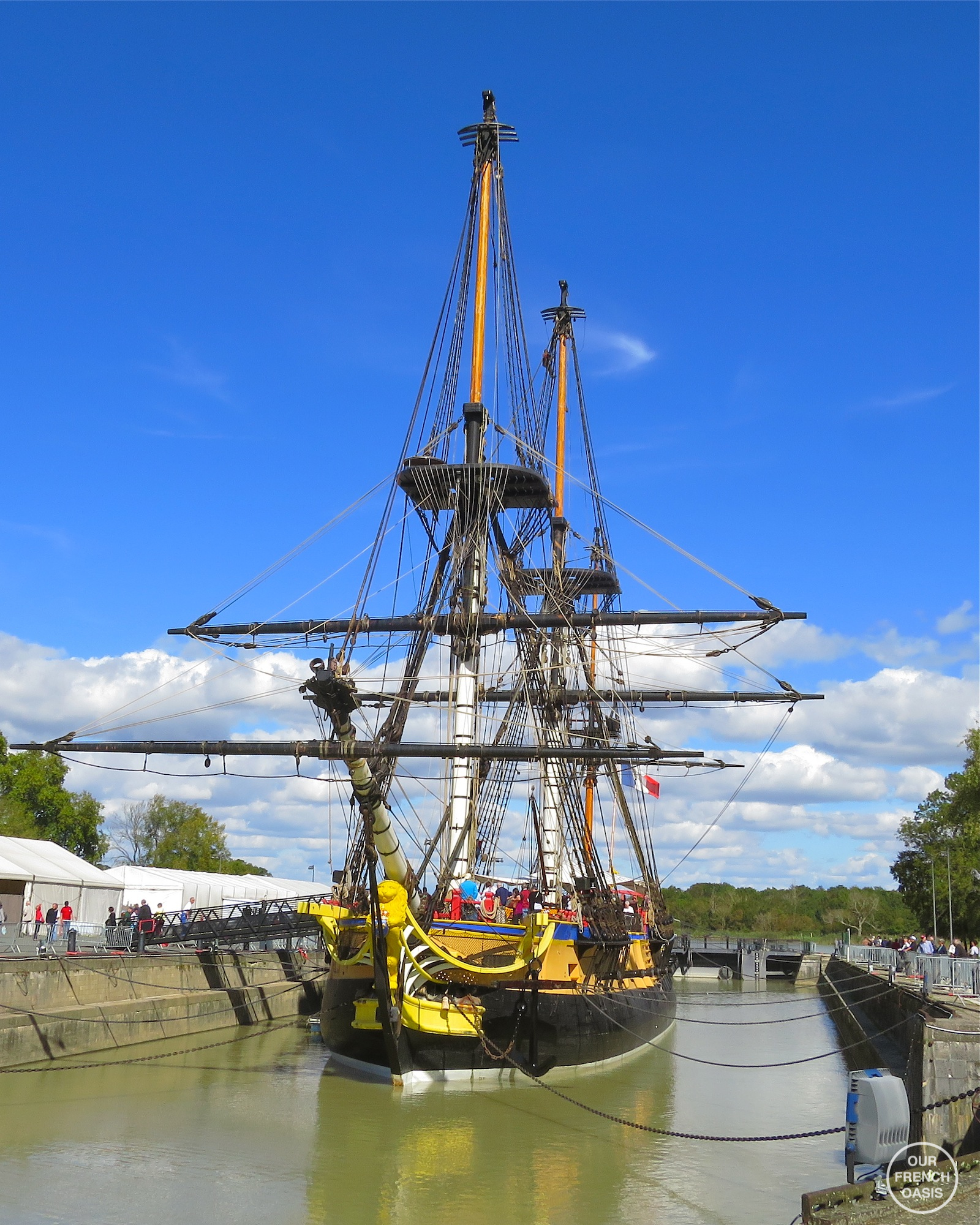 Finally we stopped by the Hermione, a replica of the ship which became famous when she ferried the French military officer the Marquis de Lafayette to the United States in 1780 for support to the rebels in the American Revolutionary War. She was grounded and wrecked in 1793. In 1997 her replica was started in Rochefort. She was completed last year and in April 2015 she began her return voyage to the USA arriving safely on the American coast in June. In August she returned to Rochefort amongst many celebrations.