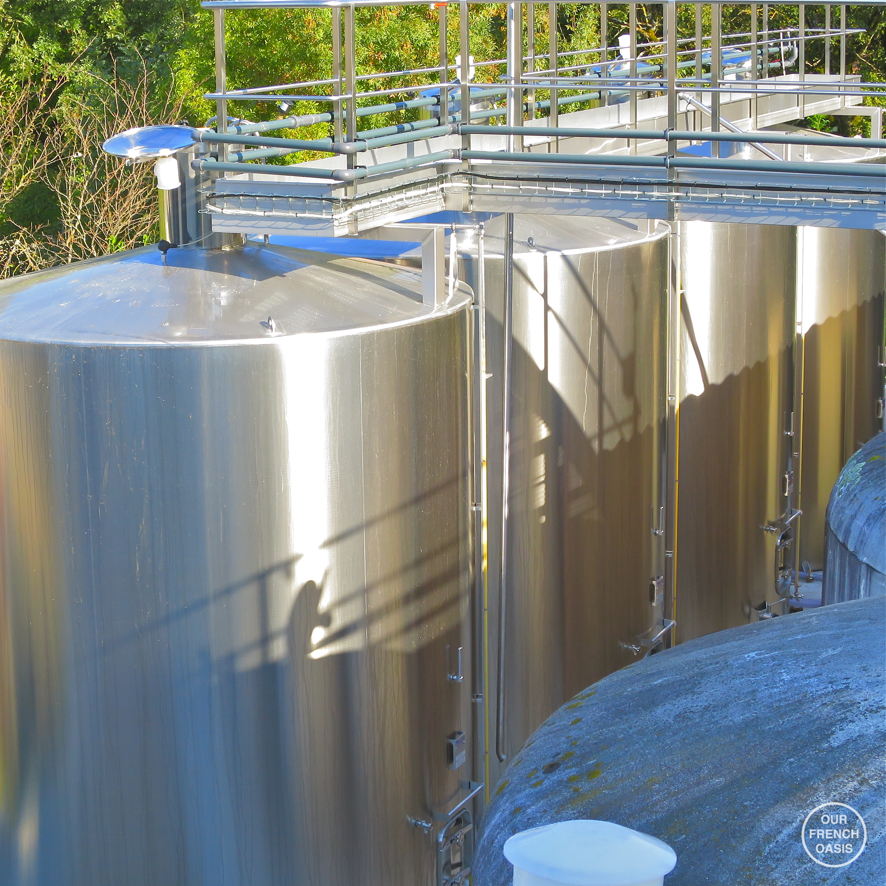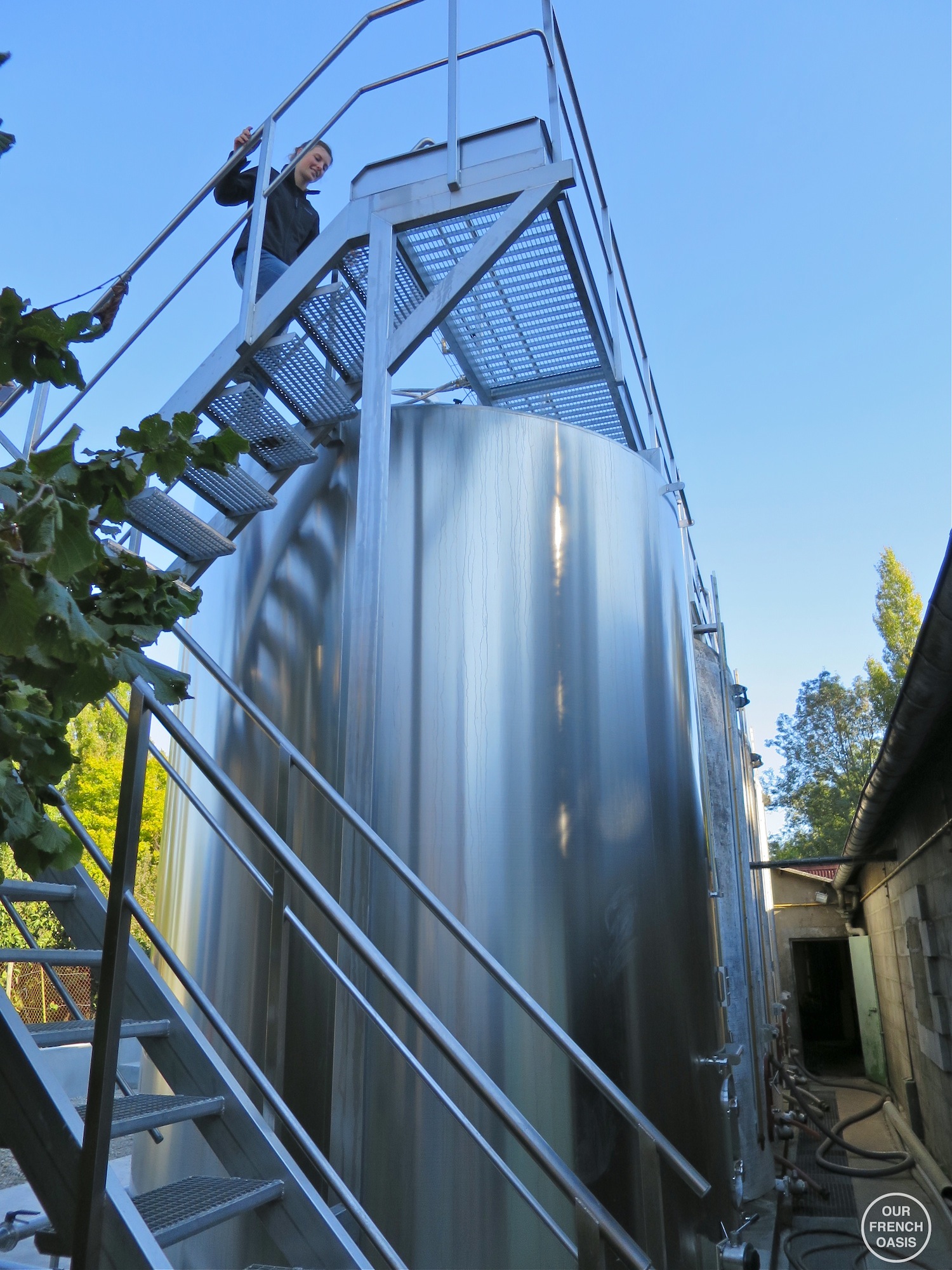 With this in mind we set off on an impossibly beautiful morning after dropping the children off at school, and 40 minutes later bumbled down a lane between serried ranks of gnarled vines, our destination a collection of buildings deep in a sun-dappled corner amongst the fields. Tall machines scurried to and fro on the slopes, and distant figures stooped and pointed. It seemed a little busy for a domaine that was not harvesting, but we were not duly concerned as we turned the corner amongst some low buildings and pulled to a stop by the accueil, or ‘welcome’ sign. Down the side of a huge chai, we could see a very pretty tall young lady awaiting us, and we knew we had met our hostess for the visit, Elodie, the daughter of the house. We closed the car doors and went down to say hello, only to discover to our consternation that things had changed due to weather and the day had been designated a harvest day after all, and we were in the midst of one of the busiest days of the year! We felt successively worse as the visit progressed and we came to realise that Elodie was an integral cog in the operation, not just a pretty face for visitors. How she managed to make time for us is still a wonder, but in between tapping a myriad of computer screens, shutting some valves, opening others, and overseeing the arrival of several tons of grapes for pressing, she still managed to give us a 5-star personal tour!