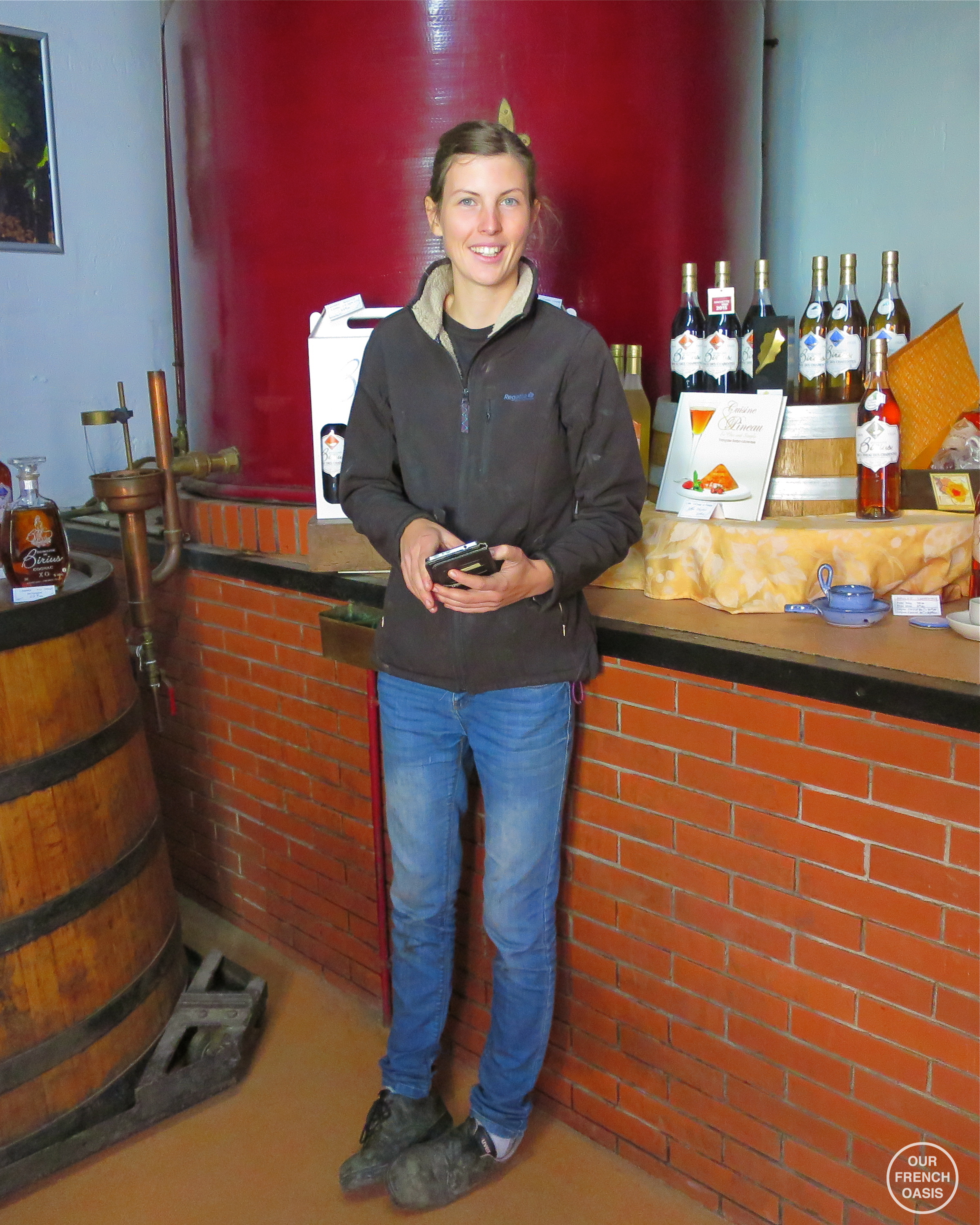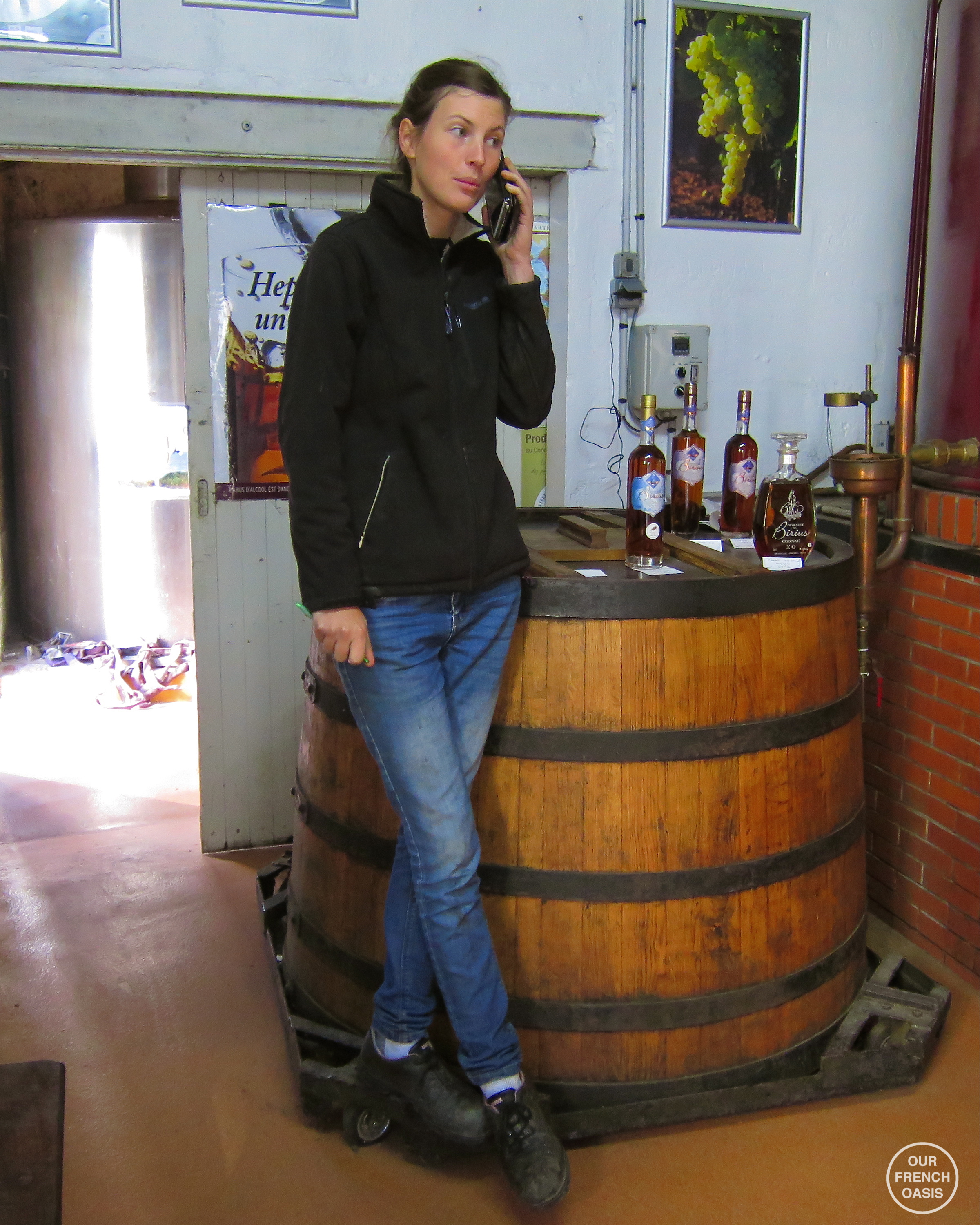 The domaine has 32 hectares of grapes, and when we left the chai and stepped outside to the storage containers for the pressed grape-juice, we realised that the amount of grapes those hectares produce means there is a LOT of liquid to be dealt with! We were both quite shocked to be faced with what seemed to be a small refinery, and as we climbed the aluminium ladder to the catwalk above the huge stainless vats, we began to grasp the enormity of the industry before us. Below our feet, tractors rolled in with grapes to crush, and Elodie surreptitiously pushed buttons on panels, appraised thermometers and tapped sight-tubes as we talked. She mentioned how many litres of liquid each container contained, but I confess I ran out of zeros to add as we talked numbers. Almost all of the grapes grown at Domaine Birius are Ugni Blanc, one of a few varieties legally allowed to be used for cognac production. The juice from these fruits is thin, acidic and dry, and although the Domaine does produce Pineau des Charentes, some wine and some sparkling grape juice, their main product is solely eaux-de-vies and the final product – cognac. The tall vats wobbled in fermentation and lids lay open for escaping gas, and Elodie remarked casually that this is a very trying time for the producers, as too many things can go wrong, the worst of which is an unseen virus that causes an unusual rot, undetectable by anything but a laboratory test. As it takes between 8 to 9 litres of pure grape juice to make a litre of cognac, even I could see that substantial quantities of wine are needed for cognac production.