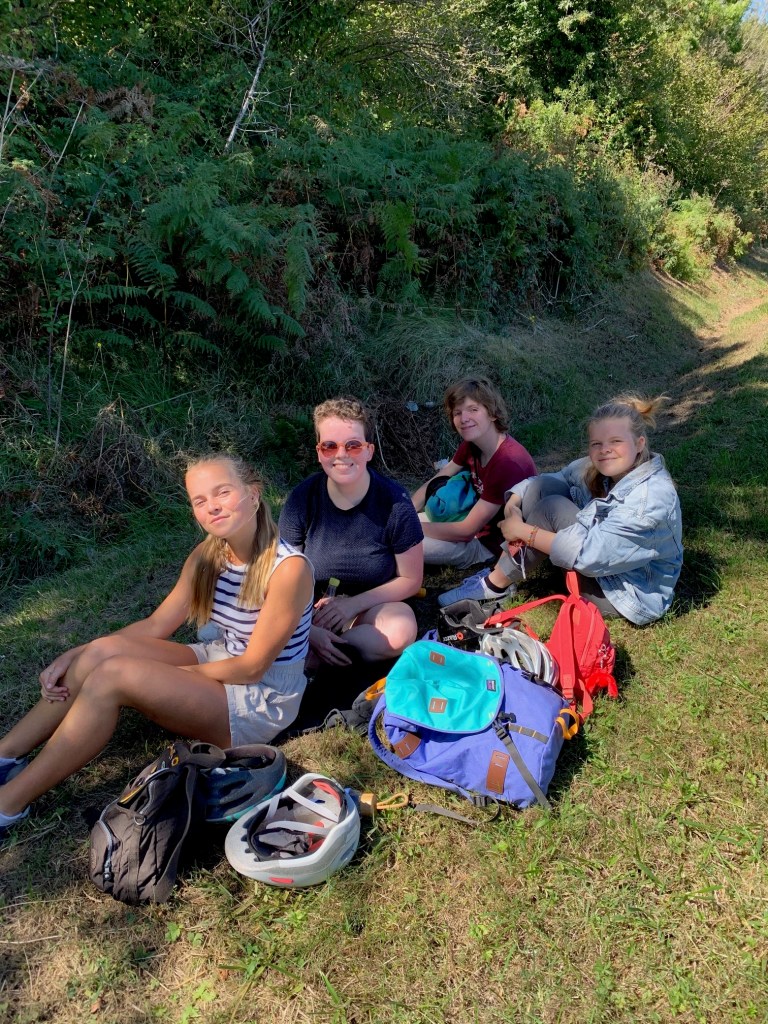 It meant a day off school for two of our girls, justified by the fact that we all felt they would learn far more from this experience than a day in the classroom. We needed to avoid crowds and we wanted a vantage point and so a plan was hatched. We would go by bike as all the roads were closed to cars from 9am onwards. In blisteringly hot sun we set off across the Marais. Backpacks bulging with a delicious picnic, our spirits were high as we peddled through the open marshland. After about 6km we took a detour through the woods and down some farm tracks, arriving at the road where the riders would pass by in a few hours time. There were already a handful of cars and tables set up in the shade, families eating lunch, playing pétanque on the dusty track under the trees, a scene so typically French. So relaxed, so unhurried and so utterly normal to be eating beside a main road with a proper table, chairs and tablecloth and glass of rosé to hand! We left our bikes against a tree, donned our masks, said ‘bonjour’ to everyone as we passed and walked a hundred yards down the road to a shady spot. We were totally alone and set up our own mini feast. Nowhere near as glamorous as that of our fellow French Tour followers! But to be fair we had bikes and they had cars!